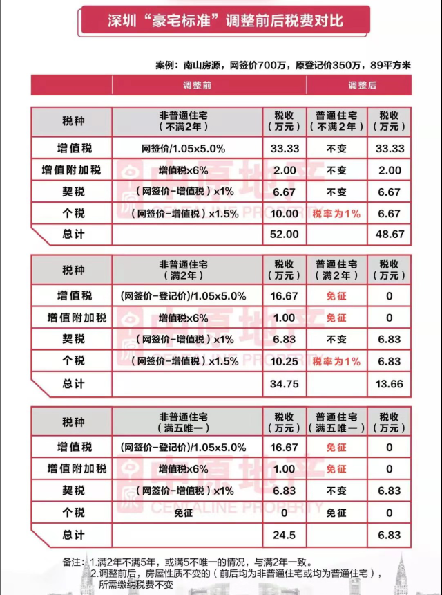 深圳“豪宅標(biāo)準(zhǔn)”調(diào)整前后稅費(fèi)對(duì)比。來(lái)自深圳中原研究中心