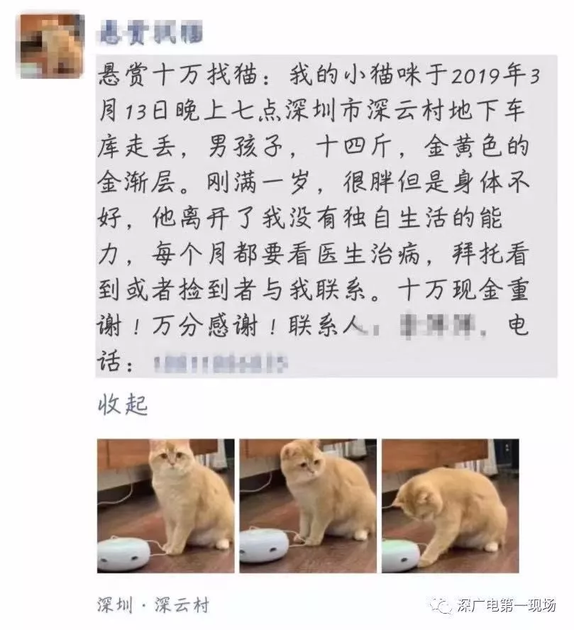 我們欄目之前也報(bào)道過此類“重金尋寵物”的事件。今年三月深云村居民李女士在朋友圈發(fā)布“十萬(wàn)重金尋貓”的啟事。