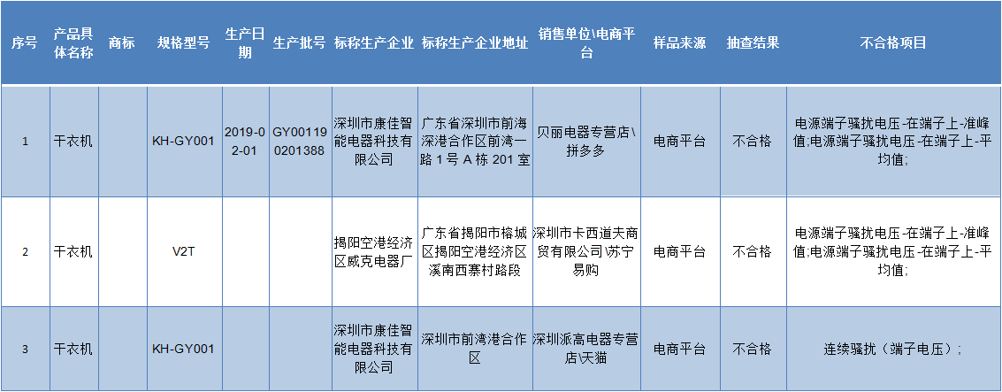 晶報(bào)2019年11月20日訊 近日,江蘇省市場監(jiān)管局對衣物干燥機(jī)產(chǎn)品質(zhì)量進(jìn)行了監(jiān)督抽查,共抽查50批次。抽查結(jié)果顯示,合格30批次,不合格20批次。其中,深圳有3批次不合格。分別是深圳市康佳智能電器科技有限公司生產(chǎn)的2批次干衣機(jī),及揭陽空港經(jīng)濟(jì)區(qū)威克電器廠生產(chǎn)的在深圳市卡西道夫商貿(mào)有限公司、蘇寧易購等電商平臺銷售的干衣機(jī)。