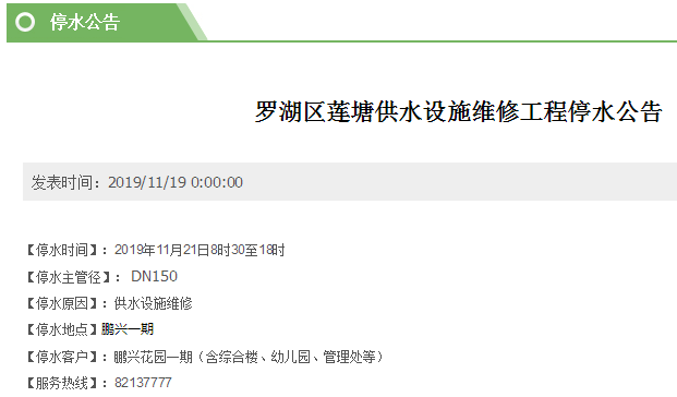 11月21日,福田、南山、羅湖區(qū)均有小區(qū)計(jì)劃停水,其中羅湖區(qū)鵬興花園一期從早上8時(shí)30分至下午18時(shí)停水,其它地方均在晚間。