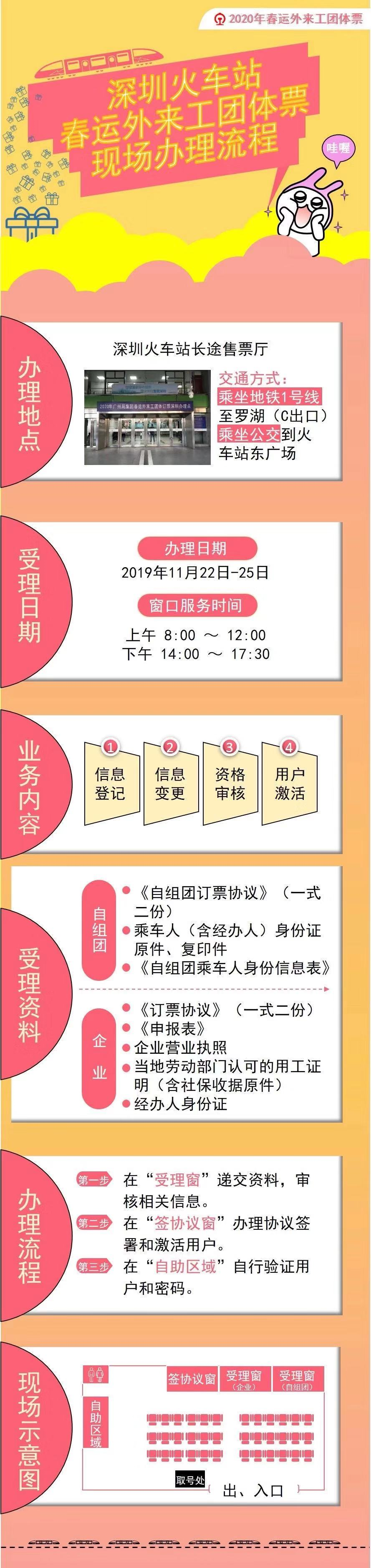 深圳特區(qū)報2019年11月22日訊 記者從深圳火車站獲悉,2019年11月22日—25日期間,訂票企業(yè)(自組團)可到深圳火車站集中辦理新企業(yè)(自組團)登記、老企業(yè)(自組團)信息變更、自組團身份信息提交、資格審核、用戶激活等一條龍業(yè)務(wù),詳情請看下圖↓↓↓
