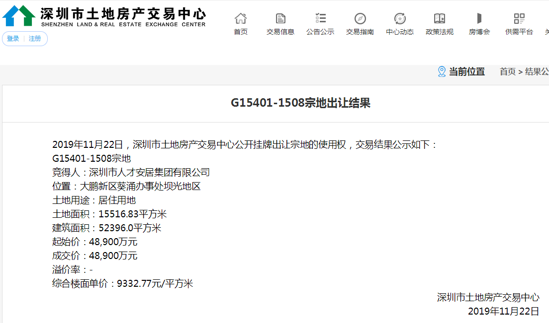 見圳客戶端·深圳新聞網(wǎng)2019年11月27日訊 記者從深圳政府在線網(wǎng)站了解到,11月22日下午,深圳市首宗出售型人才住房用地--G15401-1508宗地即大鵬新區(qū)壩光03-08地塊,被深圳市人才安居集團(tuán)以總價(jià)4.89億元成功競(jìng)得。