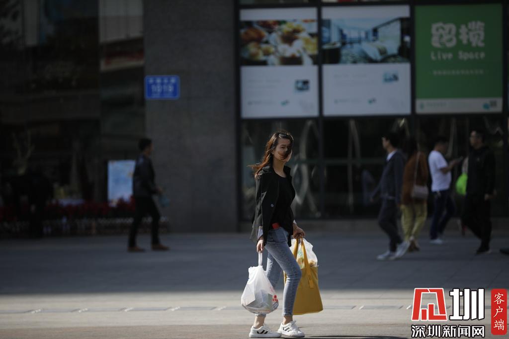 華強北商圈,大風(fēng)吹亂了一位出行女士的頭發(fā)。