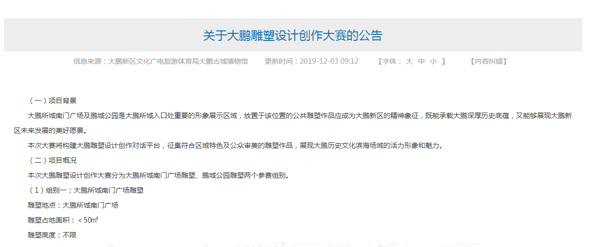 見圳客戶端·深圳新聞網(wǎng)2019年12月3日訊 為了展現(xiàn)大鵬歷史文化濱海場域的活力形象和魅力,12月3日,大鵬新區(qū)文化廣電旅游體育局大鵬古城博物館啟動大鵬雕塑設(shè)計創(chuàng)作大賽,征集大鵬所城南門廣場及鵬城公園雕塑作品,參賽不限單位或個人,最終每組作品都將評選出6名獲獎?wù)?,單項最高獲4萬元獎金,總獎金22萬元。