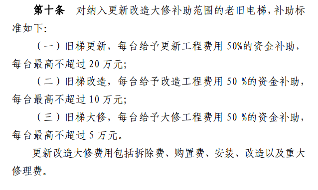 (三)舊梯大修,每臺給予大修工程費用50 %的資金補助,每臺最高不超過5萬元。