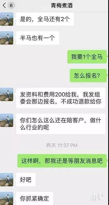 11月28日,一個(gè)網(wǎng)名為“青梅煮酒”的跑友在多個(gè)跑友群中發(fā)布了關(guān)于出售“深馬”參賽名額的消息。多名跑友私信聯(lián)系轉(zhuǎn)賬,沒(méi)想到付款后卻立即被拉黑。《深馬開(kāi)跑在即,花兩百元可買名額?多名跑友微信轉(zhuǎn)賬被騙》