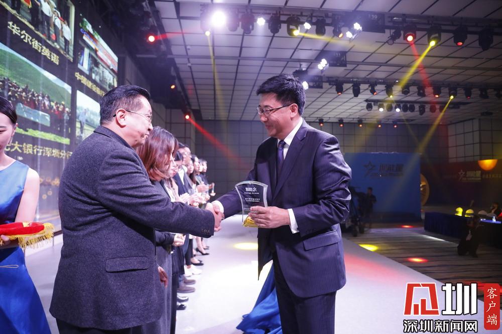 深圳報(bào)業(yè)集團(tuán)社長助理、深新傳媒董事長吉書龍為榮獲“年度公益先鋒力量”的單位代表頒獎(jiǎng)。