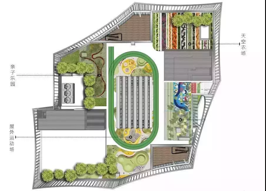 屋頂農(nóng)場充分利用空間,打造天空農(nóng)場、親子樂園、屋外運動場??罩械呐艿?,肥沃的土壤,瓜果蔬菜的金色豐收,讓自然在城市落地生根。小朋友們可以在其中,種植汗水,開花結(jié)果,收獲自然的饋贈。