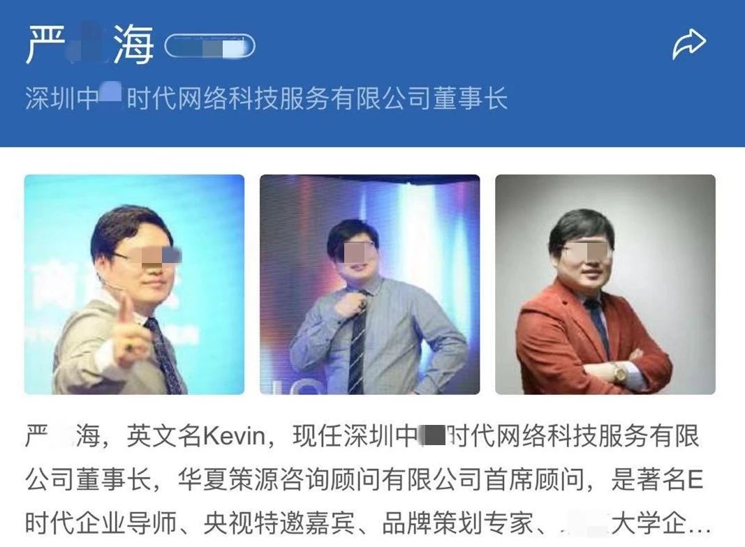 據(jù)介紹,董事長“嚴(yán)某?!睂ν庑麄髻Y料顯示:著名E時(shí)代企業(yè)導(dǎo)師、品牌策劃專家、某知名大學(xué)企業(yè)轉(zhuǎn)型升級總裁班實(shí)踐導(dǎo)師,擔(dān)任過多家知名企業(yè)的顧問。據(jù)被抓獲的團(tuán)伙成員交代,嚴(yán)某海自稱擁有雙碩士學(xué)歷,是香港大學(xué)學(xué)者,還是牛津大學(xué)博士。