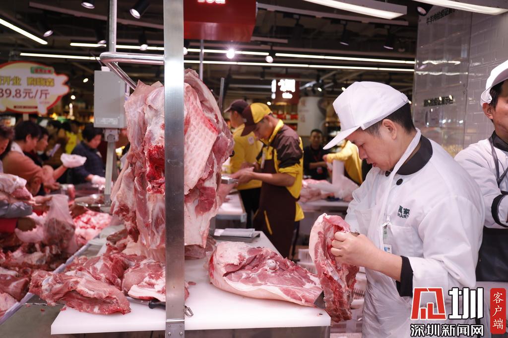 生肉區(qū),一位工作人員正在切肉。