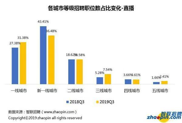 從趨勢(shì)上看,短視頻機(jī)構(gòu)隨著用戶的下沉也在下沉,而直播領(lǐng)域呈現(xiàn)進(jìn)一步向一線城市聚集的趨勢(shì)。2019年三季度,短視頻行業(yè)在一線城市的招聘需求占比較去年同期下降了7.21個(gè)百分點(diǎn),新一線、二線、三線等比例均有提高;直播行業(yè)在一線城市的招聘需求占比則是提高了4個(gè)百分點(diǎn)。(記者 莊瑞玉)