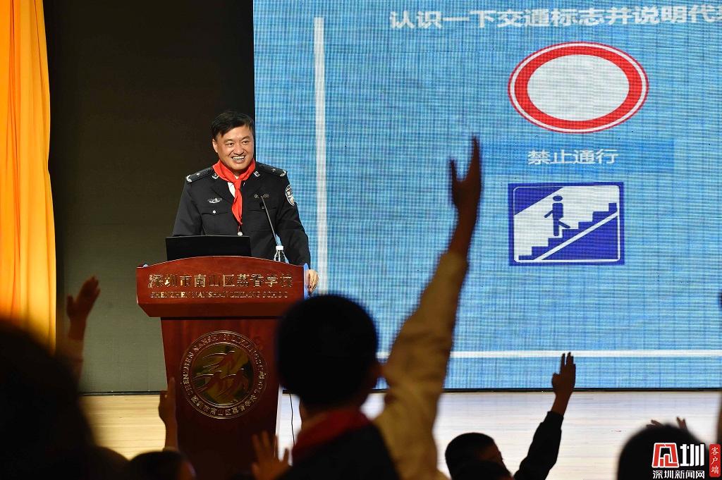 2019年2月20日,南山區(qū)荔香學(xué)校,市交警局局長徐煒正在向?qū)W生們講述交通安全知識。為加強(qiáng)2019年度新學(xué)期校園交通安全宣傳工作,深圳交警聯(lián)合市教育局在新學(xué)期開學(xué)期間,在全市范圍開展“交通安全教育第一課”授課活動。
