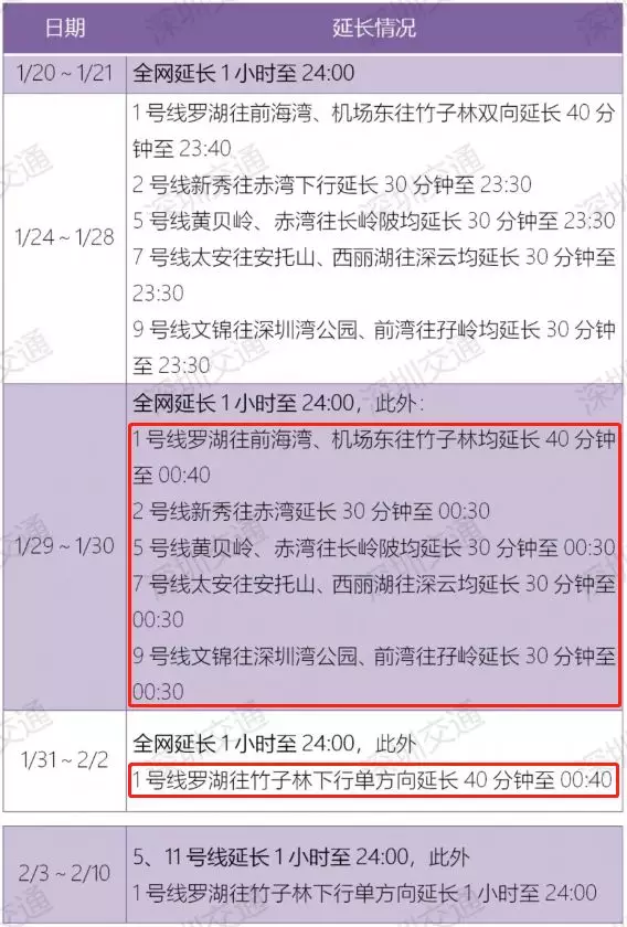 2020年春運期間深圳地鐵延長情況表