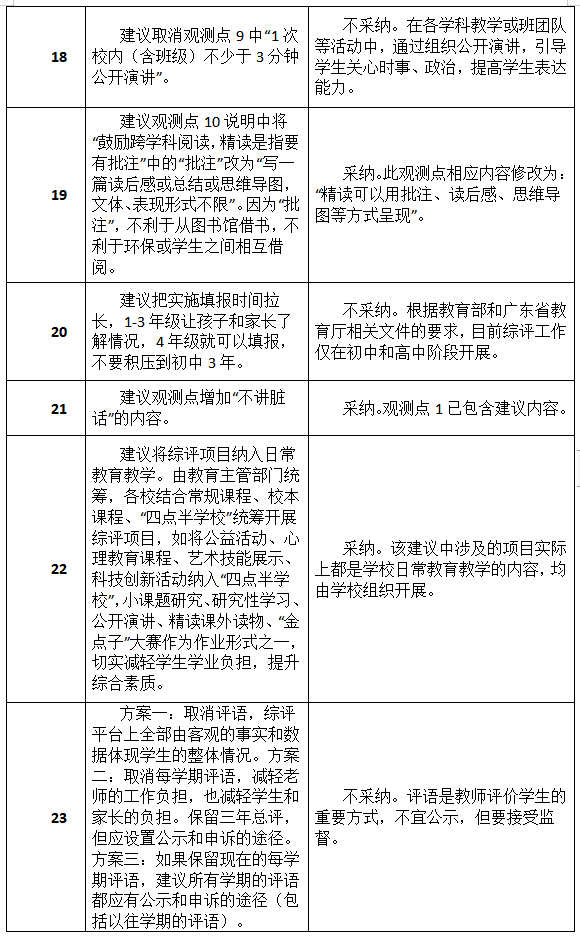 市教育局通報指出,在意見征集期間,該局共收到304個郵件及2個信件。市教育局對上述建議進行了統(tǒng)一的分類,這些建議被分成了34類,并組織了專家學者進行了認真研究。其中,有關平臺簡化、允許修改更新、建立綜評宣導隊伍等14類建議被采納,另有5類建議被部分采納,余下15類建議沒有被采納。