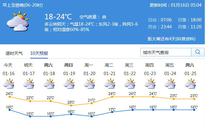 預(yù)計16日多云間陰天,氣溫17~24 ℃;17日多云,氣溫略降,15~22 ℃;18~22日多云,可見陽光。