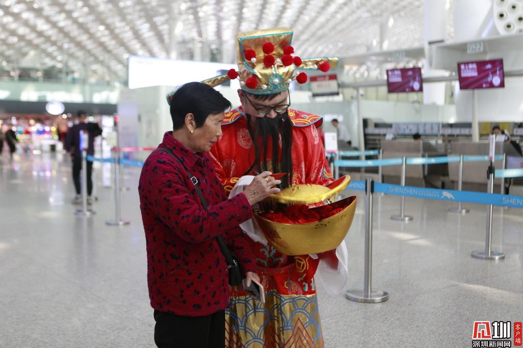 深圳航空工作人員扮“財神”給旅客送紅包。