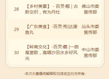 據了解,為慶祝新中國成立70周年,生動展示黨的十八大以來,廣東高舉習近平新時代中國特色社會主義思想偉大旗幟、深入推進美麗鄉(xiāng)村建設的豐碩成果,廣東鄉(xiāng)村微視頻大賽于8月20日正式啟動。本次微視頻大賽歷時2個多月,共征集參賽作品9375條,審核展示5996條。廣東學習平臺PC端和手機APP開設參賽作品展播專題。經過網上展播和網絡投票,以及專家評審,評選出一等獎30名,二等獎100名,三等獎1000名,以及最佳創(chuàng)意獎、最佳畫面獎、最佳人氣獎各10名。佛山、廣州、惠州等10個地級以上市黨委宣傳部獲大賽組織獎。