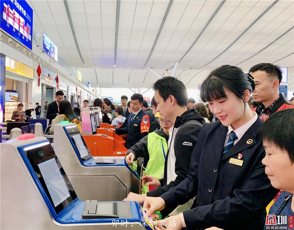 早晨6點(diǎn)50分左右,深圳北站候車(chē)大廳內(nèi),車(chē)站工作人員羅瑜欣幫助乘客檢票。