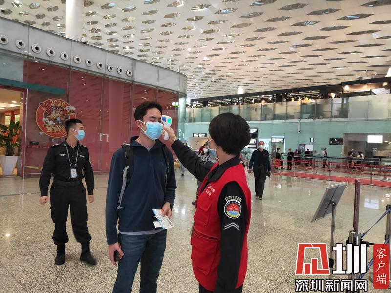 在深圳機(jī)場(chǎng),工作人員對(duì)往來乘客進(jìn)行體溫檢測(cè)。