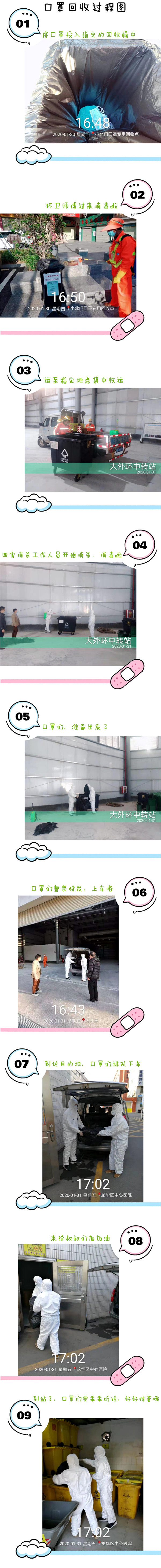 據(jù)了解,廢棄口罩每天由環(huán)衛(wèi)服務(wù)公司定時收集運送至街道回收站,再由消殺公司工作人員著防護服現(xiàn)場消毒后統(tǒng)一運送到龍華區(qū)中心醫(yī)院進行統(tǒng)一專業(yè)化銷毀處理(詳細流程見下圖)。整個處理流程福城街道市政管理服務(wù)中心嚴格把控,每天安排專人進行現(xiàn)場督促處理,堅決防止廢棄口罩因處理不當引起的二次污染。