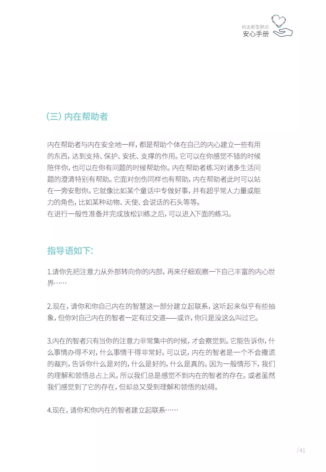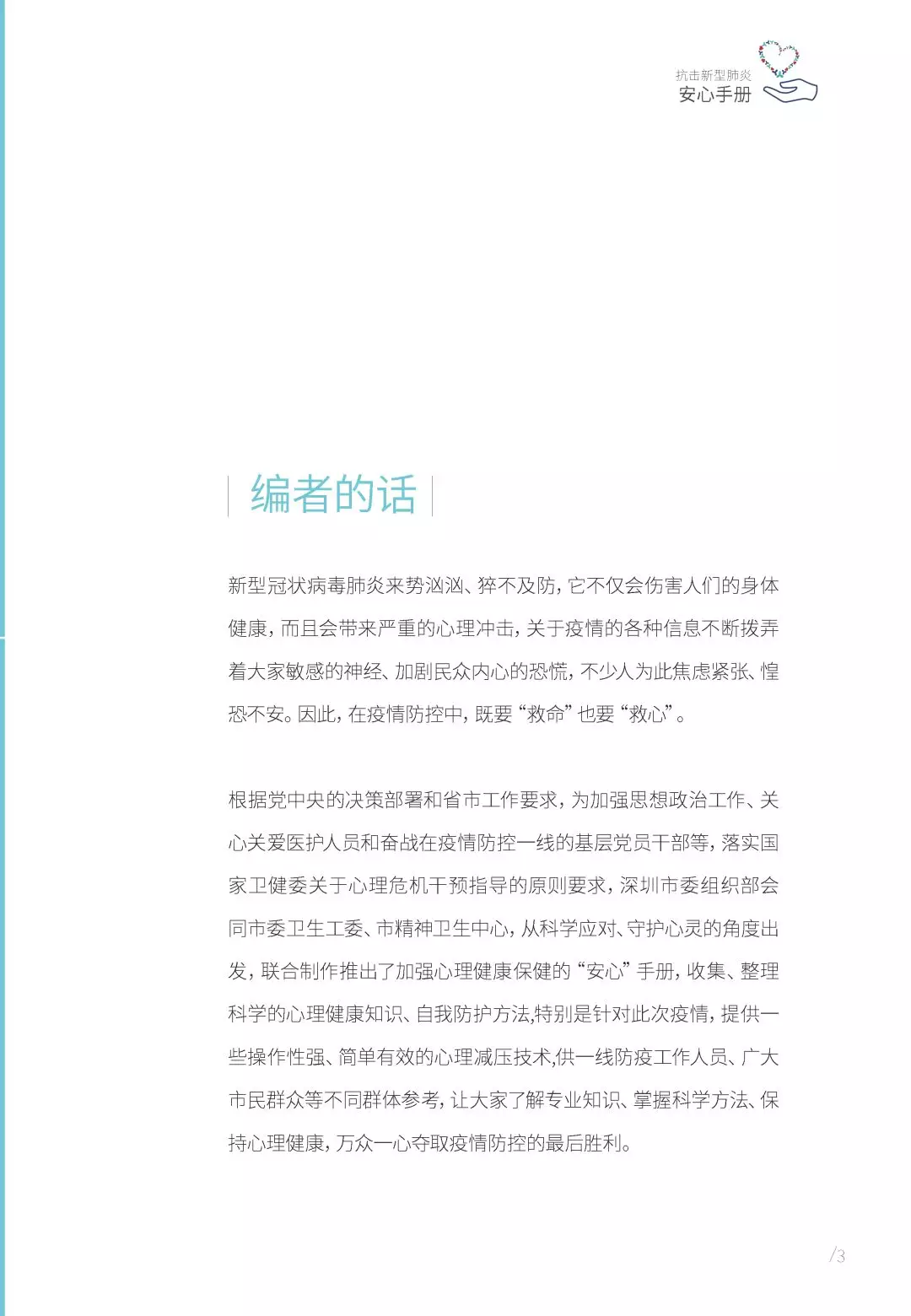 根據(jù)黨中央的決策部署和省市工作要求,為加強(qiáng)思想政治工作、關(guān)心關(guān)愛(ài)醫(yī)護(hù)人員和奮戰(zhàn)在疫情防控一線的基層黨員干部等,落實(shí)國(guó)家衛(wèi)健委關(guān)于心理危機(jī)干預(yù)指導(dǎo)的原則要求,深圳市委組織部會(huì)同市委衛(wèi)生工委、市精神衛(wèi)生中心,從科學(xué)應(yīng)對(duì)、守護(hù)心靈的角度出發(fā),聯(lián)合制作推出了加強(qiáng)心理健康保健的“安心”手冊(cè),收集、整理科學(xué)的心理健康知識(shí)、自我防護(hù)方法,特別是針對(duì)此次疫情,提供一些操作性強(qiáng)、簡(jiǎn)單有效的心理減壓技術(shù),供一線防疫工作人員、廣大市民群眾等不同群體參考,讓大家了解專(zhuān)業(yè)知識(shí)、掌握科學(xué)方法、保持心理健康,萬(wàn)眾一心奪取疫情防控的最后勝利。