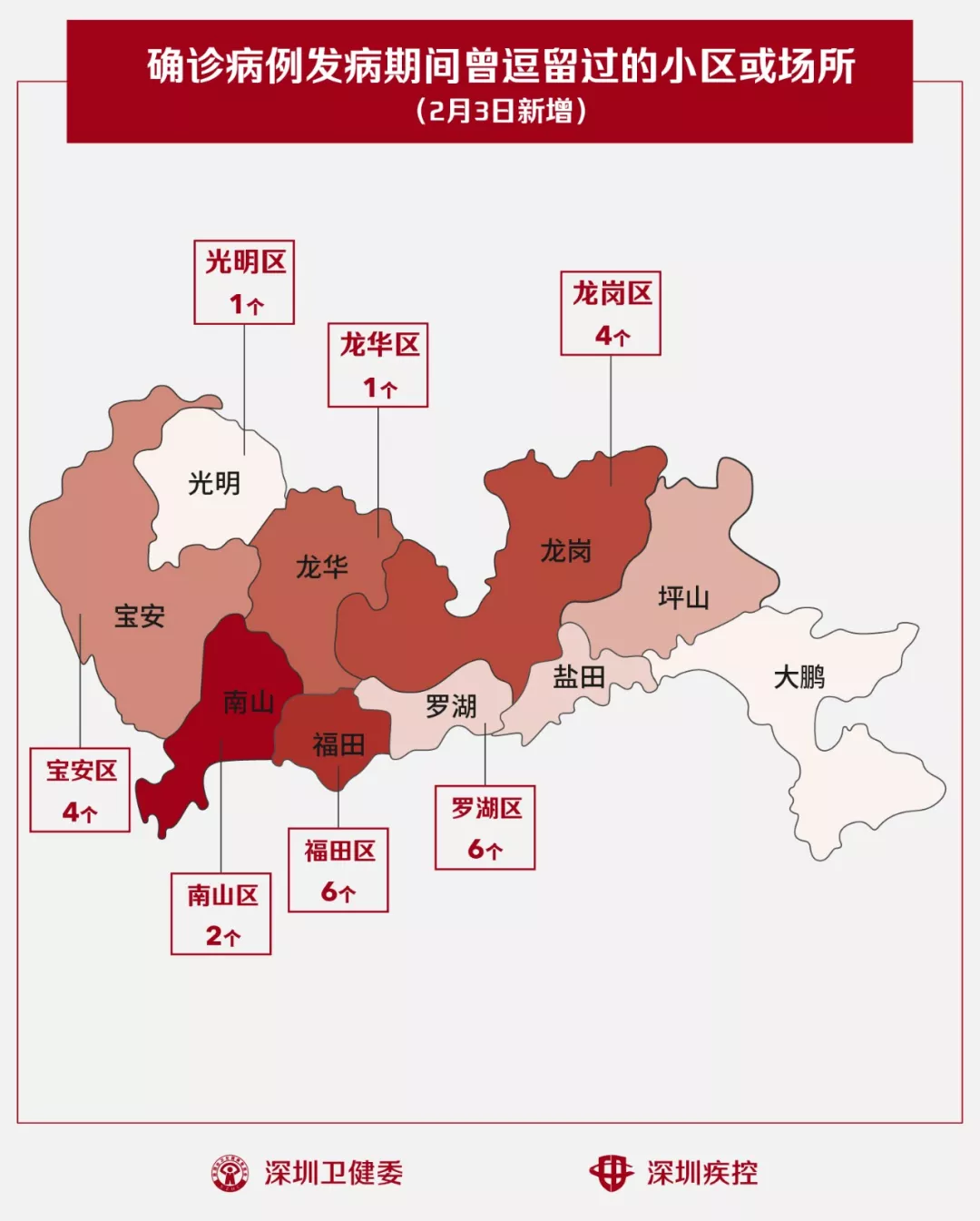 2月3日,疾控專業(yè)人員通過最新的流行病學(xué)調(diào)查確認(rèn),深圳新增24個(gè)小區(qū)(場(chǎng)所),有新確診的病人在出現(xiàn)病征期間曾經(jīng)逗留。