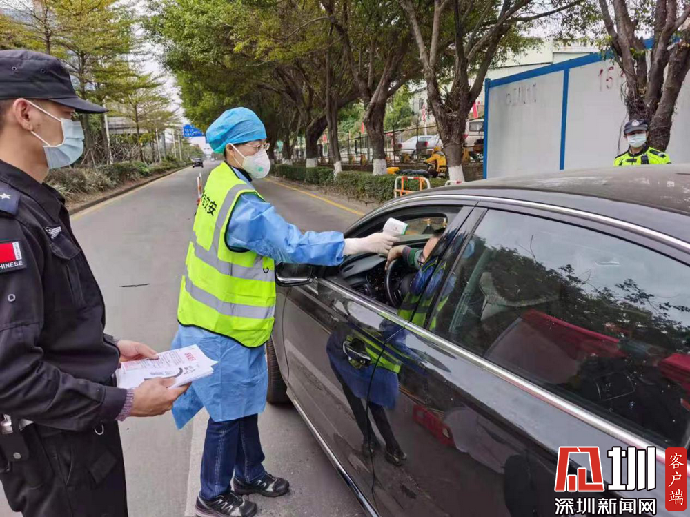 圖說:協(xié)同合作,街道同志測(cè)體溫,公安同志派發(fā)溫馨提示。