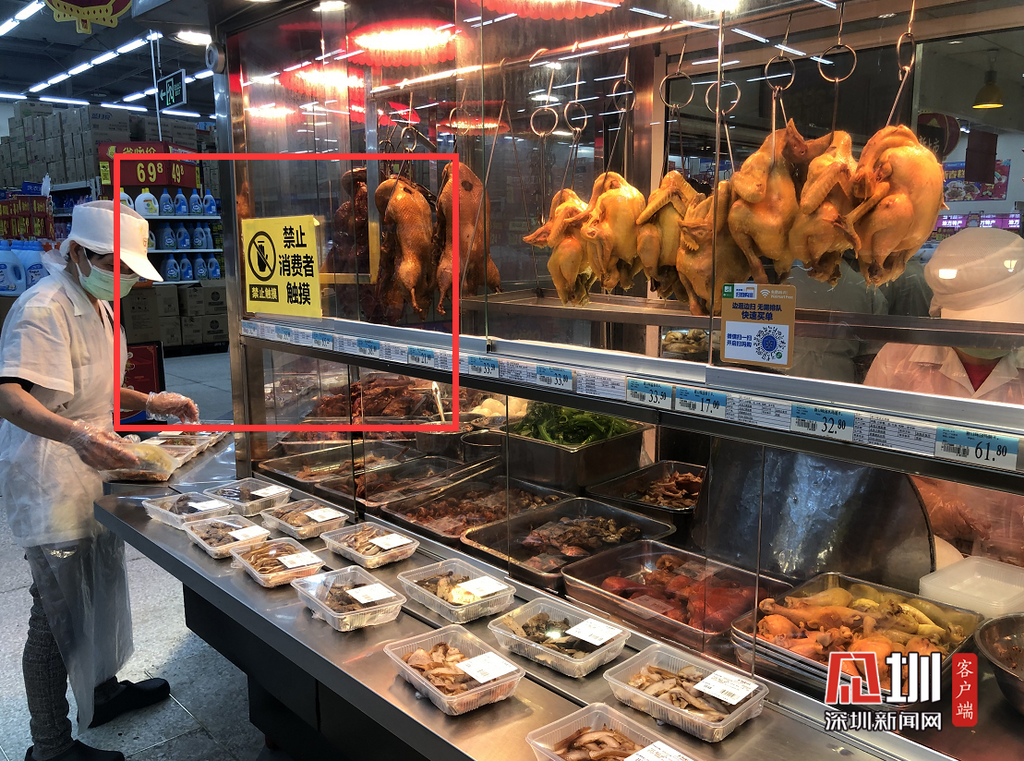 《公告》中提到,禁止商場(chǎng)、超市、糕點(diǎn)店、水果店提供食品“試吃”服務(wù)。記者看到,景田北沃爾瑪超市熟食區(qū)有明顯禁止消費(fèi)者觸摸等標(biāo)志?!耙咔榉揽仄陂g,我們是禁止給市民提供試吃的?!蔽譅柆斚嚓P(guān)負(fù)責(zé)人說道。