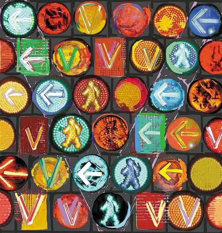 梁宇透露,這件作品的創(chuàng)作四易其稿,將信號燈所指代的“社會規(guī)則”加以排列強化,以此強調(diào)“秩序”本身在與疾病博弈混亂環(huán)境中的重要性。作品以濃烈的對比色彩、緊密排列的幾何圖形試圖傳達當下人們的緊張情緒和焦慮心態(tài)。同時,信號燈中“行走”、“前進”、“Victory”的提示標識,被清晰地提煉出來,成為能讓畫面安定的因素,望帶給觀者一點思緒的寧靜與心靈的慰藉。