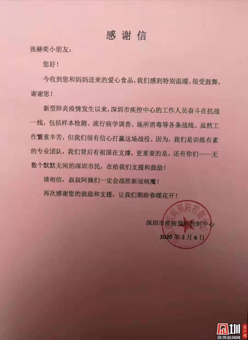 深圳疾控中心寫給張赫奕小朋友的感謝信