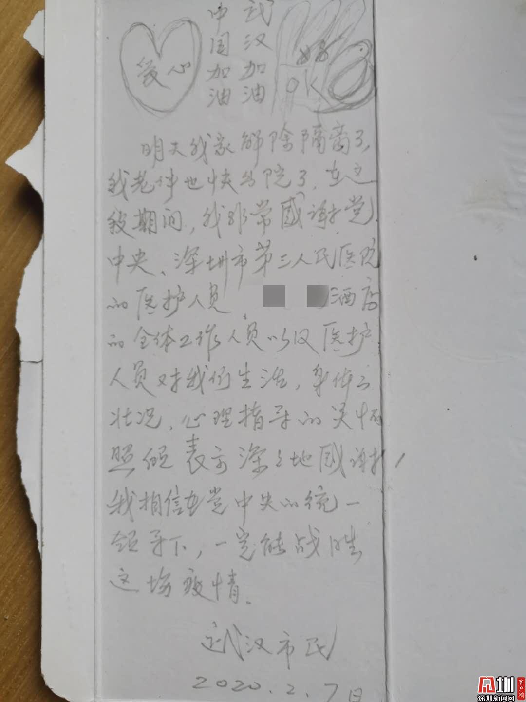 2月7日,一位來深的武漢市民在離開桃源定點(diǎn)隔離酒店前,匆忙中不忘撕下一片紙巾盒,用酒店的鉛筆留下一張暖心紙條,對(duì)陪他度過14天隔離期的工作人員表達(dá)由衷的感激,對(duì)全民抗“疫”的前景表示必勝的信心。