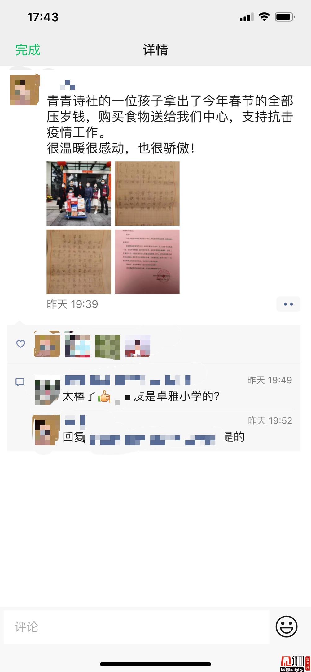 從與家人的密切交談中,他了解到防疫一線工作人員的辛苦,便主動(dòng)聯(lián)系了在深圳疾控中心工作的桃源青青詩(shī)社創(chuàng)始人王老師。因?yàn)橘I不到口罩,在王老師的建議下,張赫奕決定捐贈(zèng)食品給加班的工作人員補(bǔ)充營(yíng)養(yǎng)。