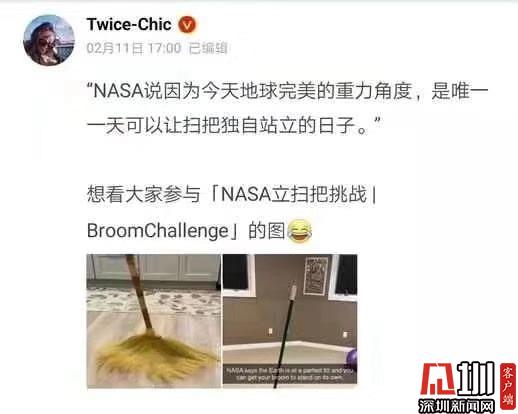 見圳客戶端·深圳新聞網(wǎng)2020年2月11日訊 (見圳客戶端、深圳新聞網(wǎng)記者 吳英敏)2月11日,有網(wǎng)友在微博曬出兩張掃把直立的照片:“宅在家里試了一下NASA立掃把挑戰(zhàn),據(jù)說一年中只有今天可以立起來,親測(cè)有效!”記者也在朋友圈發(fā)現(xiàn)許多朋友紛紛曬出掃把直立成功的圖片,有網(wǎng)友稱,“宅家立掃把”將全國(guó)人民心相連了!隨后,人民日?qǐng)?bào)微博辟謠稱,真相是,掃帚能立起來與今天的引力無關(guān),每天都可以立,只要你能找到平衡!