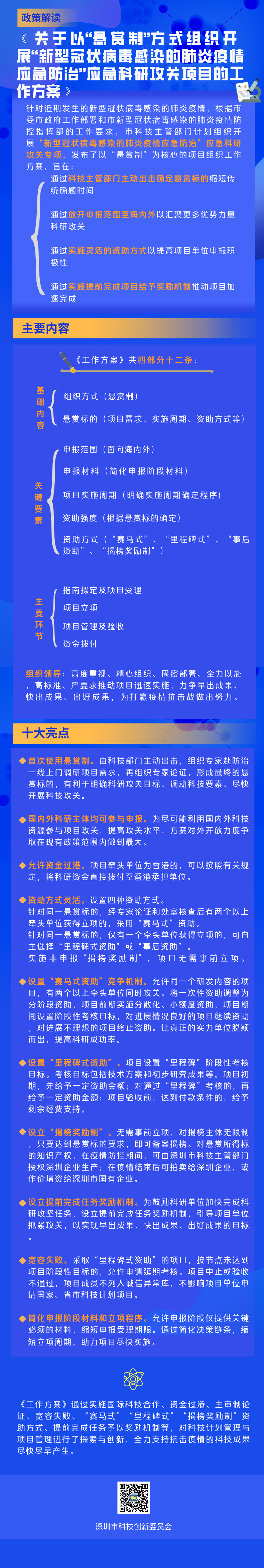 據(jù)悉,該方案首次使用懸賞制,由科技部門主動(dòng)出擊,組織專家赴防治一線上門調(diào)研項(xiàng)目需求,再組織專家論證,形成最終懸賞標(biāo)的。深圳市科創(chuàng)委相關(guān)負(fù)責(zé)人表示,以“懸賞”為方案核心有利于明確科研攻關(guān)目標(biāo)、調(diào)動(dòng)科技要素、盡快開(kāi)展科技攻關(guān)。此外,為盡可能利用國(guó)內(nèi)外科技資源參與項(xiàng)目攻關(guān),提高攻關(guān)水平,方案對(duì)外開(kāi)放力度爭(zhēng)取在現(xiàn)有政策范圍內(nèi)做到最大,國(guó)內(nèi)外科研主體均可參與申報(bào)。