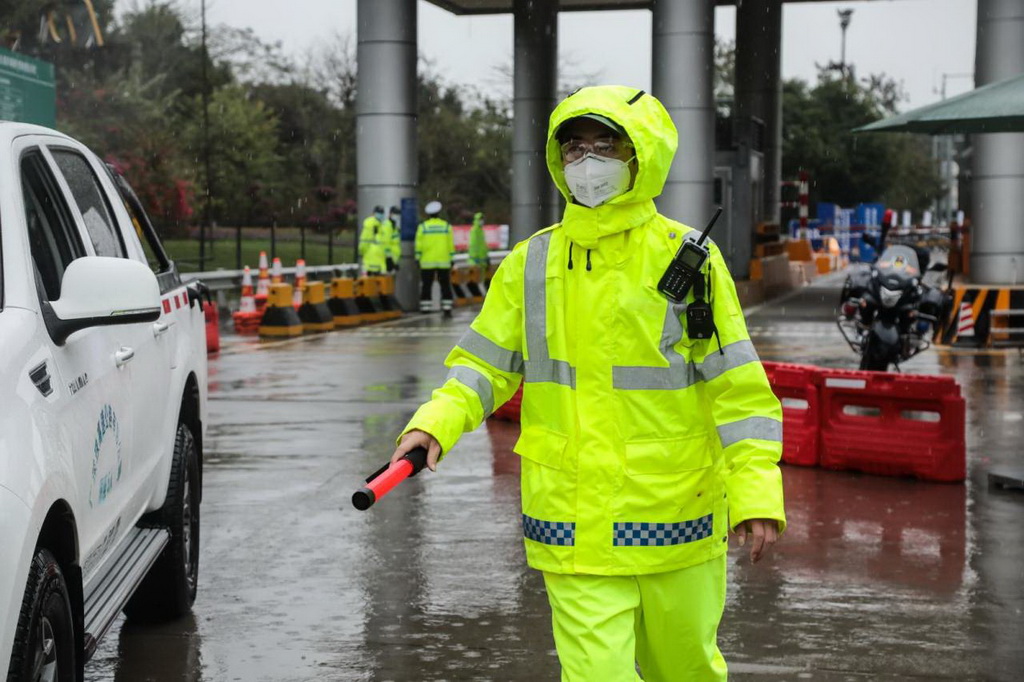 2月11日,在G94高速深圳觀瀾收費(fèi)處,深圳龍華機(jī)訓(xùn)大隊(duì)無(wú)人機(jī)飛行隊(duì)的民警操作懸掛有申報(bào)二維碼的無(wú)人機(jī)在候檢的車(chē)輛間飛行。