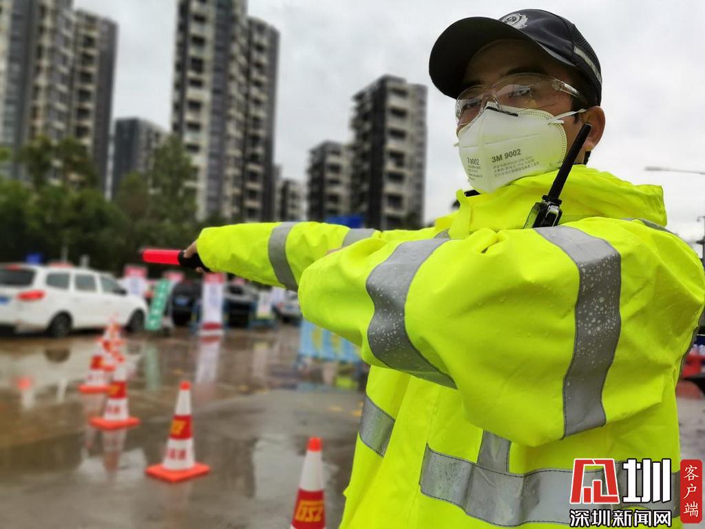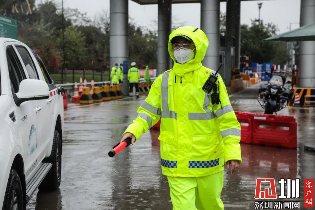 暴雨來臨,深圳交警民警在檢疫點(diǎn)安裝雨棚。