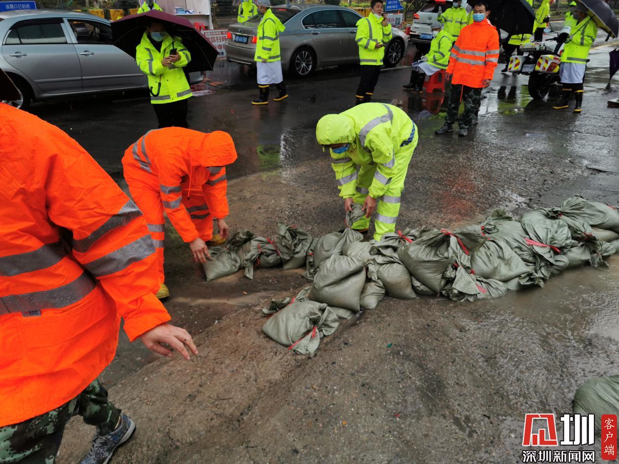 龍崗布吉街道一線工作者在路面筑沙袋墻,將雨水?dāng)r截。