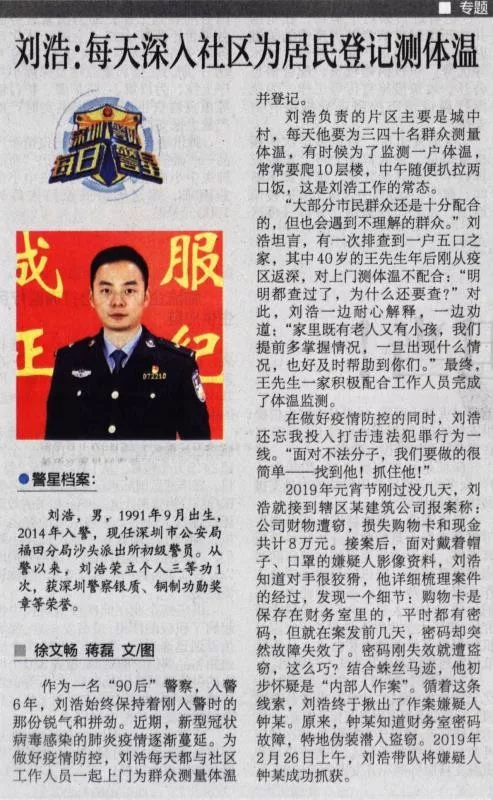 作為一名“90后”警察,入警6年,劉浩始終保持著剛?cè)刖瘯r的那份銳氣和拼勁。近期,新型冠狀病毒感染的肺炎疫情逐漸蔓延。為做好疫情防控,劉浩每天都與社區(qū)工作人員一起上門為群眾測量體溫并登記。