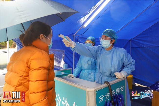 在葵涌人民醫(yī)院預(yù)檢分診處,護(hù)士為就診者檢測(cè)體溫。(見(jiàn)圳客戶(hù)端、深圳新聞網(wǎng)記者 黎陽(yáng) 李小輝 通訊員 張莉)