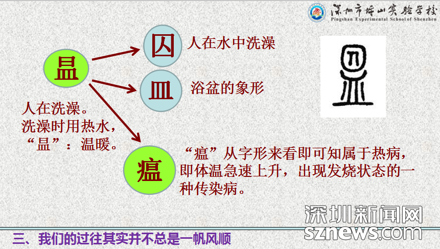 坪山實驗學校校長安國強校通過“說文解字”的形式生動講解了“瘟”與“疫”的字義,讓大朋友和小朋友們都理解了瘟疫爆發(fā)時的可怕性與嚴重性。他還從歷史的角度讓同學們了解人類與自然災害斗爭的過往。