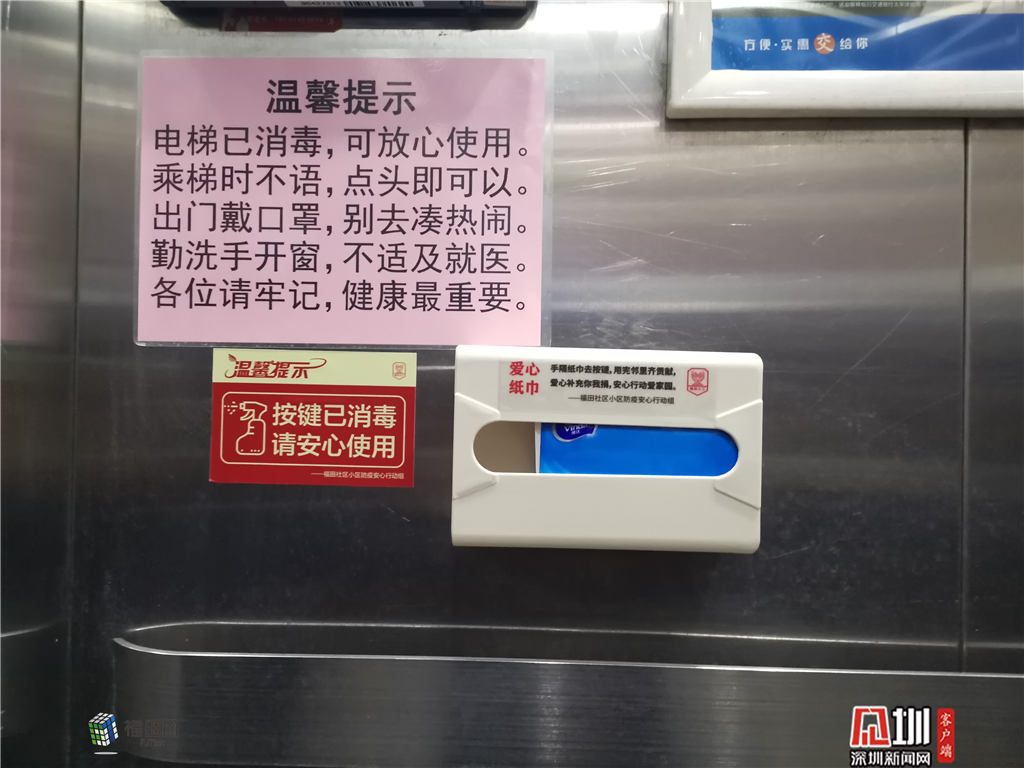 除了落實“五個100%”、“十個一律”等社區(qū)聯防聯控硬核舉措外,福田區(qū)安心行動細微之處見真章,工作人員模擬小區(qū)居民,從出家門開始到小區(qū)門口,所必經的區(qū)域進行實地感受,督促配合物業(yè)對小區(qū)防火門、電梯內外、樓道、樓梯扶手、大門把手、公共座椅等公用設施每日消毒并公示記錄,電梯間統(tǒng)一設置按鍵公用紙及紙巾回收處等一些小細節(jié),讓居民能看見實實在在的防疫措施而感到放心、安心。