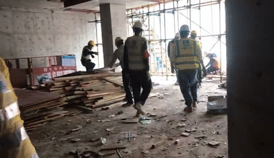 尚龍苑施工現(xiàn)場,工人們戴著口罩在進行模板拆除作業(yè)。