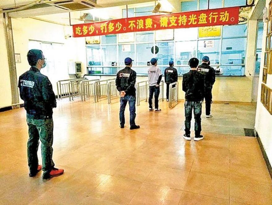位于福城街道的泰衡諾科技有限公司園區(qū),員工在臨時“食堂”分桌就餐。