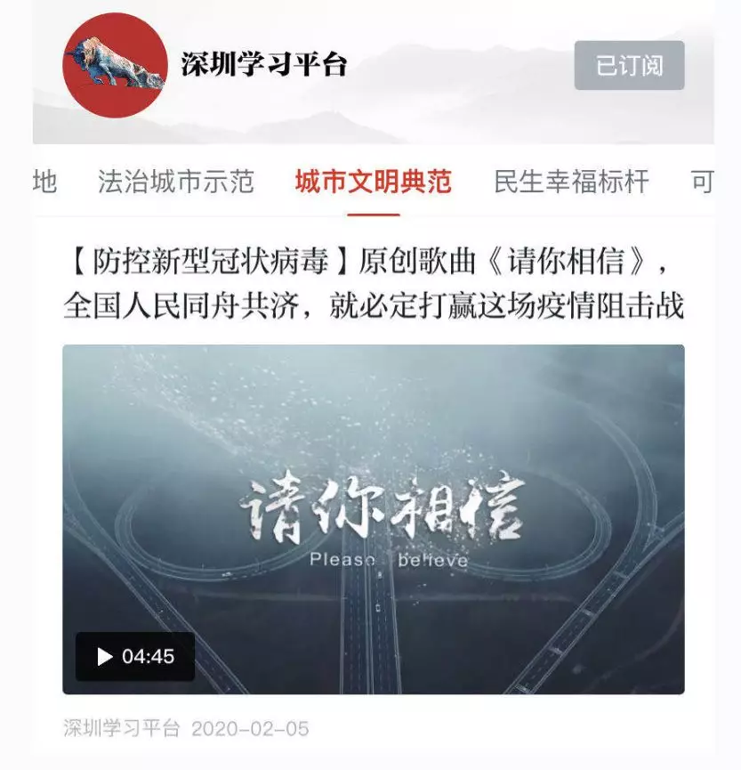 在深圳市委宣傳部的統(tǒng)一部署下,深圳的創(chuàng)作者們在短時(shí)間內(nèi)創(chuàng)作出眾多暖人心、聚力量的作品,《請你相信》是首批推出的作品之一。2月5日,《原創(chuàng)歌曲<請你相信>,全國人民同舟共濟(jì),就必定打贏這場疫情阻擊戰(zhàn)》視頻登上“學(xué)習(xí)強(qiáng)國”全國平臺(tái)“推薦”欄目,在朋友圈廣為傳播,反響良好。