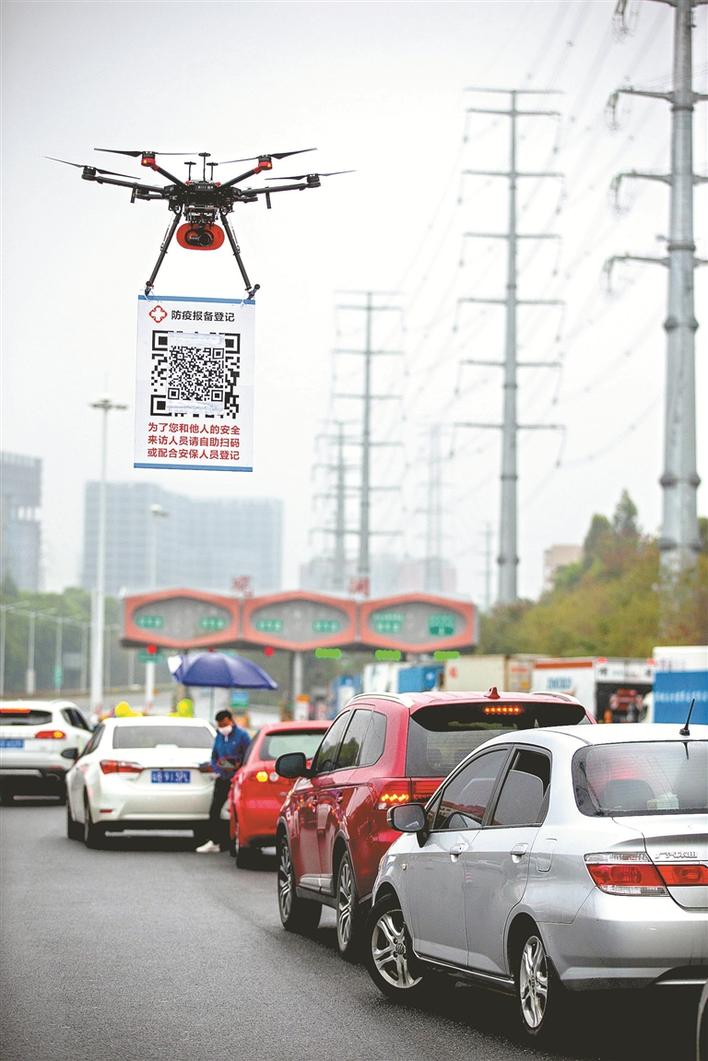 2月11日,在G94高速深圳觀瀾收費處,深圳龍華機訓(xùn)大隊無人機飛行隊的民警操作懸掛有申報二維碼的無人機在候檢的車輛間飛行。晶報記者賴?yán)鐢z