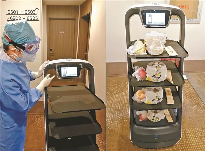 左圖是醫(yī)護(hù)人員在深圳市福田區(qū)華富街道健康驛站介紹送餐機器人;右圖是依次擺好在機器人托盤上的食物(2月7日攝)。新華社發(fā)