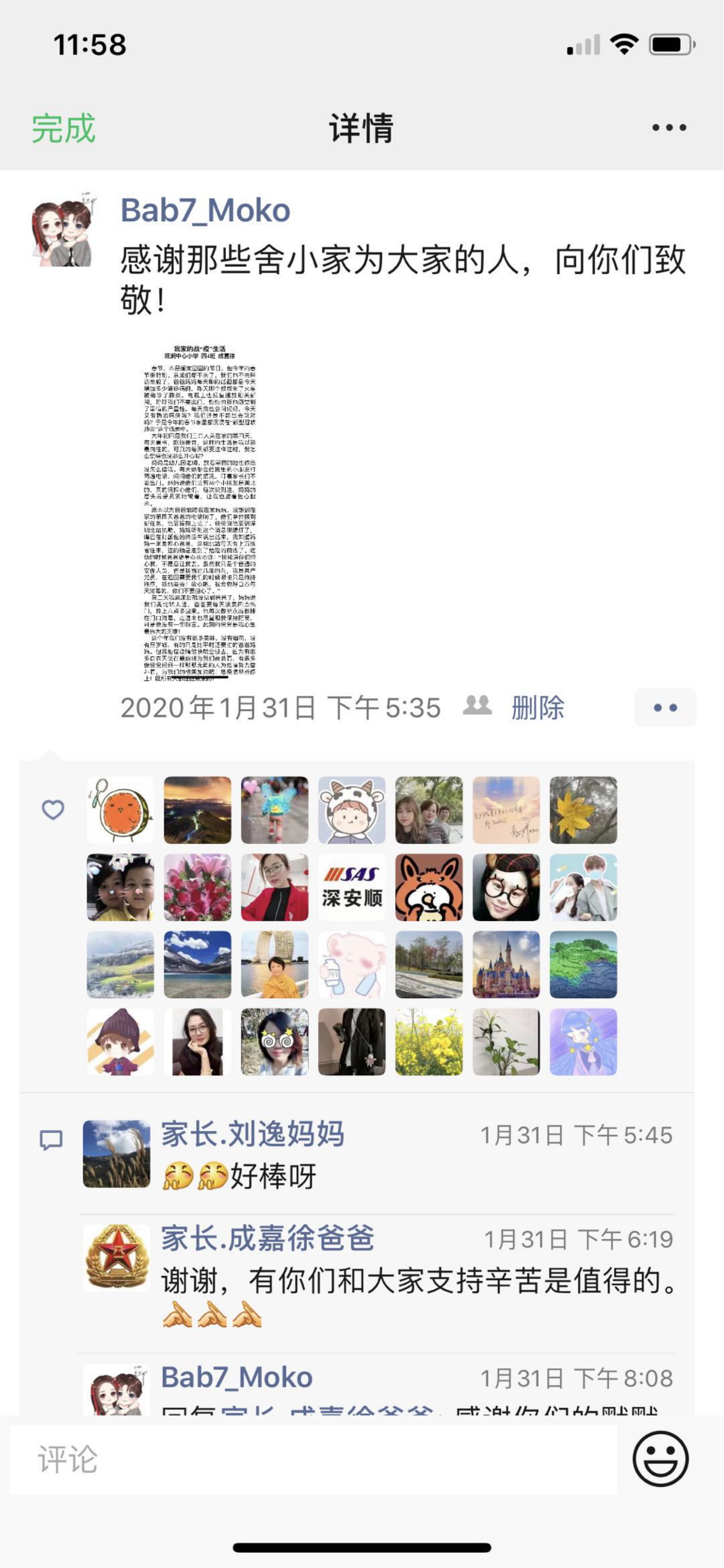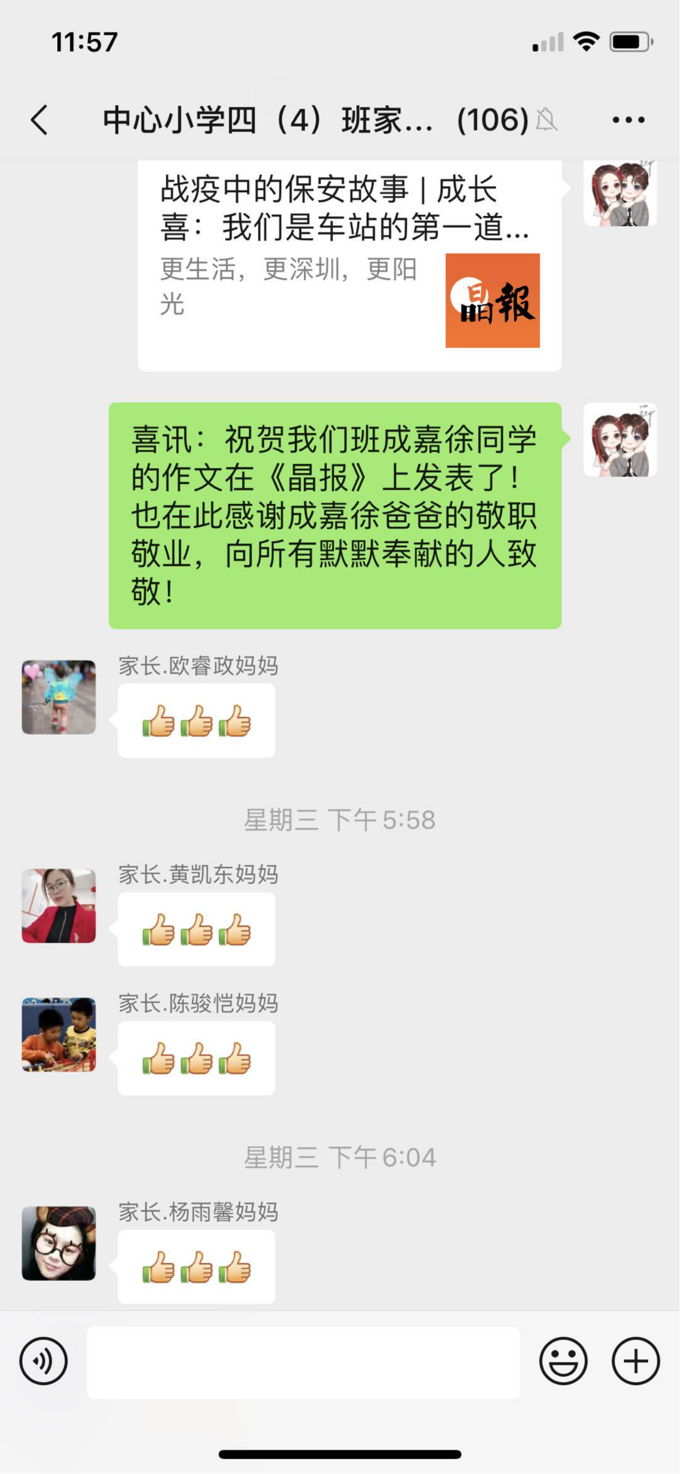 因為網(wǎng)課,班里的學(xué)生有了很多新體驗,比如嘗試自己做一頓飯,自制放大鏡,和父母一起運(yùn)動鍛煉等?!坝形粚W(xué)生寫了一篇講述他爸爸在抗疫一線忙碌工作的作文,發(fā)給我看讓我指導(dǎo),后來作文在《晶報》上登了出來,我又把作文發(fā)到班級群里分享,讓大家學(xué)習(xí)這位同學(xué),學(xué)習(xí)他爸爸這種舍小家顧大家的行為,很多家長看到了都為他們點(diǎn)贊。”