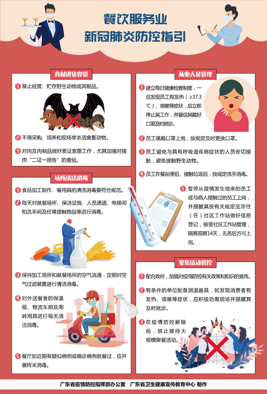 1、嚴格按照《機關(guān)、企業(yè)及工廠節(jié)后復工防控新型冠狀病毒肺炎工作指引》(粵衛(wèi)疾控函〔2020〕14號)、《餐飲服務(wù)食品安全操作規(guī)范》要求以及國家衛(wèi)生健康委員會《新型冠狀病毒感染的肺炎防控方案》《新型冠狀病毒感染的肺炎公眾防護指南》等防控要求,建立健全防控制度,壓實防控責任,嚴格從業(yè)人員管理,杜絕從業(yè)人員帶病上崗。