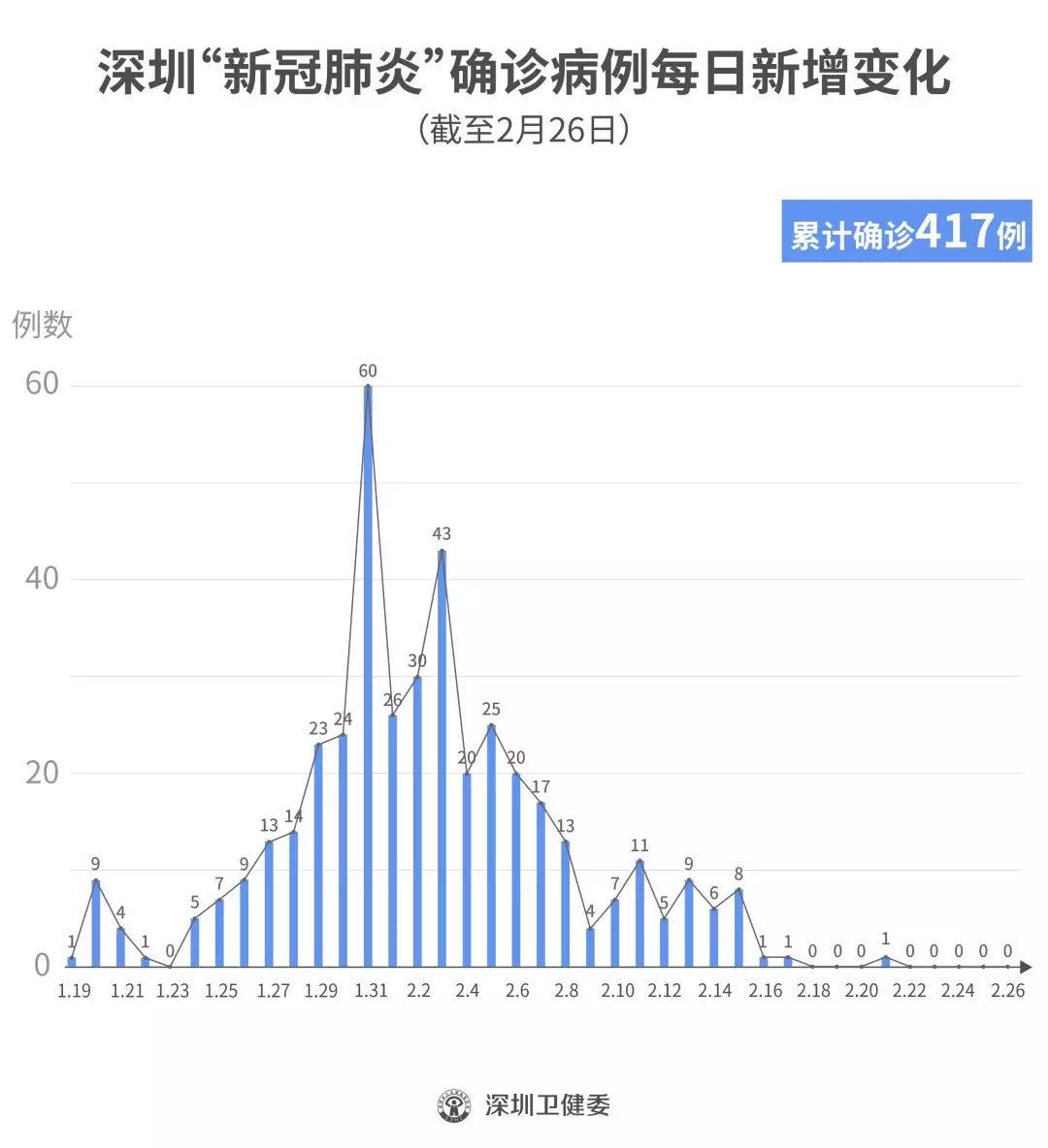 截至2月26日24時,深圳累計報告“新冠肺炎”確診病例417例。2月26日當(dāng)天全市無新增確診病例,當(dāng)天出院病例9例(從26日起不再公布出院個案)。