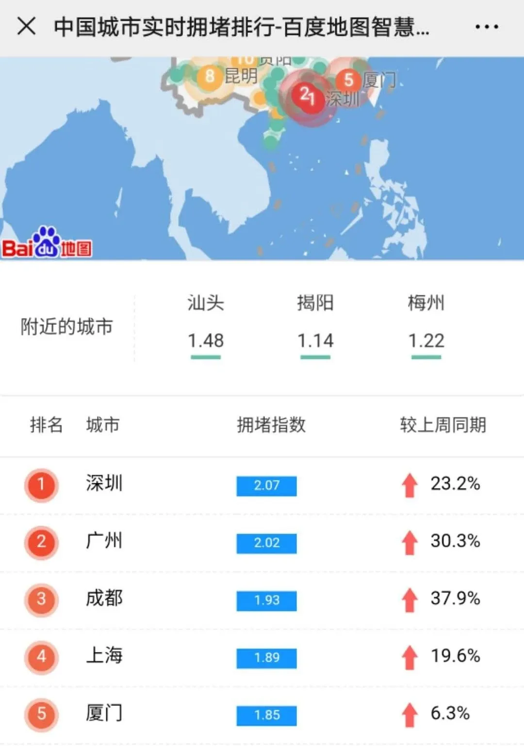 據百度地圖提供的中國城市實時擁堵排行來看,3月2日19時許,深圳擁堵指數為2.07,位居全國榜首。
